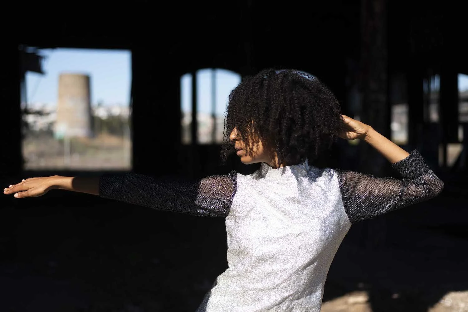 A profile image of Stephanie Hewett, a brown-skinned femme-identifying person with short, dark-brown curly hair covering her face. One arm is stretched out in front of her while her other arm is bent with her fingers resting in her hair. She wears a silver dress with black transparent sleeves.